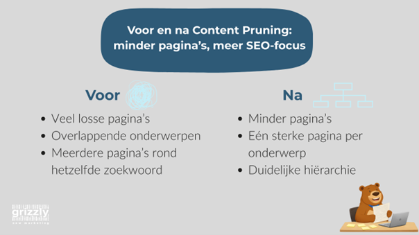 Websites die Content Pruning strategisch inzetten, zien vaak stabielere rankings, betere prestaties van bestaande pagina’s en meer focus op kernonderwerpen. Niet doordat er meer content is, maar doordat elke pagina een duidelijke rol vervult.
