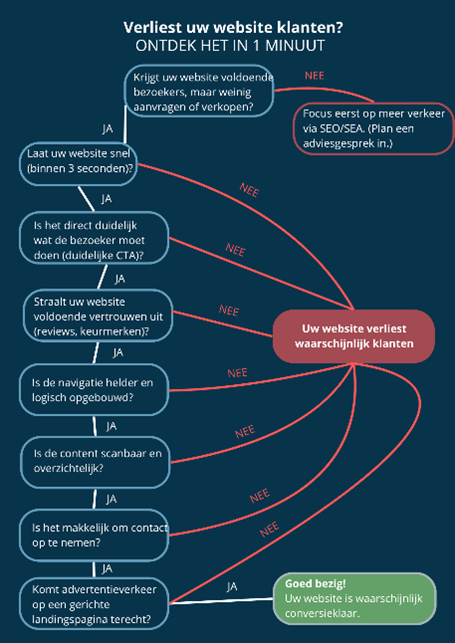 Een bezoeker wil snel kunnen vinden wat hij zoekt. Als het menu onlogisch is ingedeeld, belangrijke pagina’s moeilijk bereikbaar zijn of er te veel klikstappen nodig zijn, verliest u onnodig waardevolle kansen. Het is daarom belangrijk dat u kritisch kijkt naar de opbouw van uw website: zijn de hoofdpagina’s direct zichtbaar? Is het duidelijk waar bezoekers op moeten klikken? Wij adviseren u hier graag bij en denken mee over een logische structuur, duidelijke menunamen en slimme interne links. Zo helpt u uw bezoekers sneller naar de juiste plek en vergroot u de kans dat ze ook daadwerkelijk klant worden.