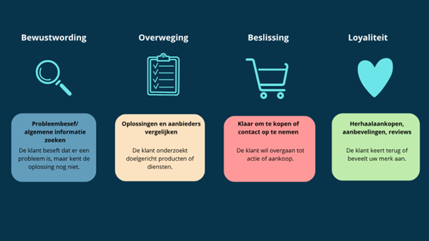 Het onlinezoekgedrag van een potentiële klant kan worden beschreven als een reis, vaak aangeduid als de customer journey (klantreis). Deze reis is zelden lineair; mensen springen heen en weer tussen de verschillende fases. Echter, door deze fases te conceptualiseren, kunnen we gerichter inspelen op hun behoeften. We onderscheiden doorgaans vier hoofdfases: