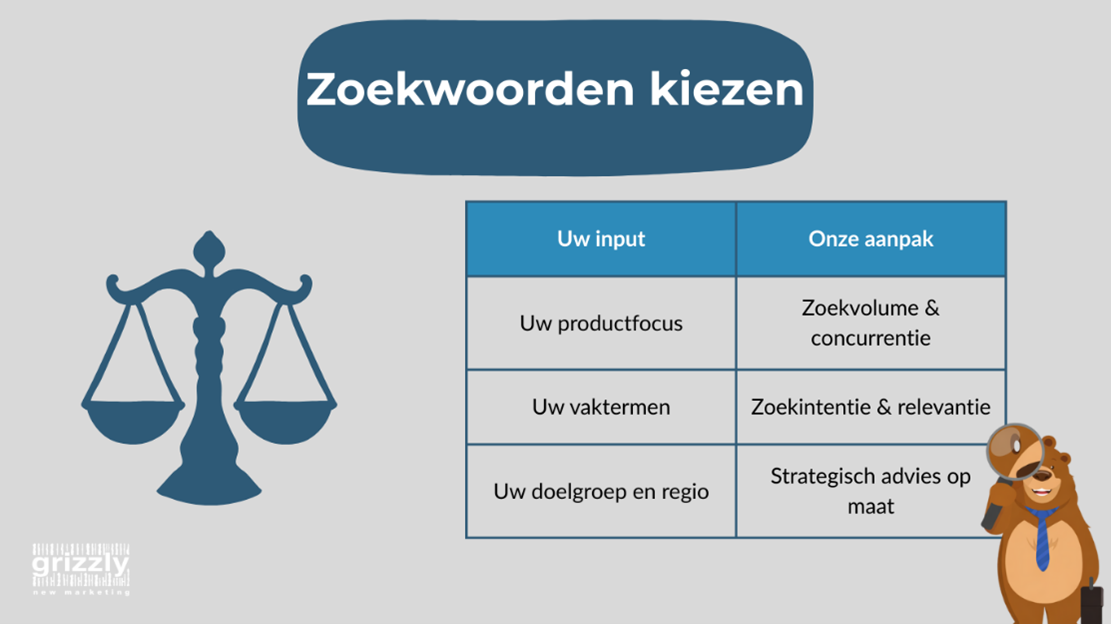 Zoekwoorden bepalen wie u online bereikt en of die mensen klant worden. Bij Grizzly begeleiden we u volledig in dit proces: van analyse tot actie. U levert de input, wij zorgen voor het resultaat. Bent u klaar om gericht te investeren in online groei? Vraag vandaag nog een gesprek aan en ontdek welke zoekwoorden uw bedrijf laten scoren.